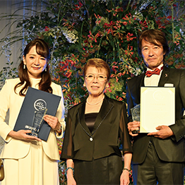 式典のフィナーレでは、この式典の司会者でもある平山深雪さんと図師英嗣さんに対して「サプライズ表彰」を行いました。JNAのイベントに欠かせない存在となったお二人に感謝を込め、仲宗根幸子理事長より表彰状とトロフィーが贈呈されました。台本にもない演出に感激し、涙ぐむ様子に会場から温かい拍手が贈られました。
