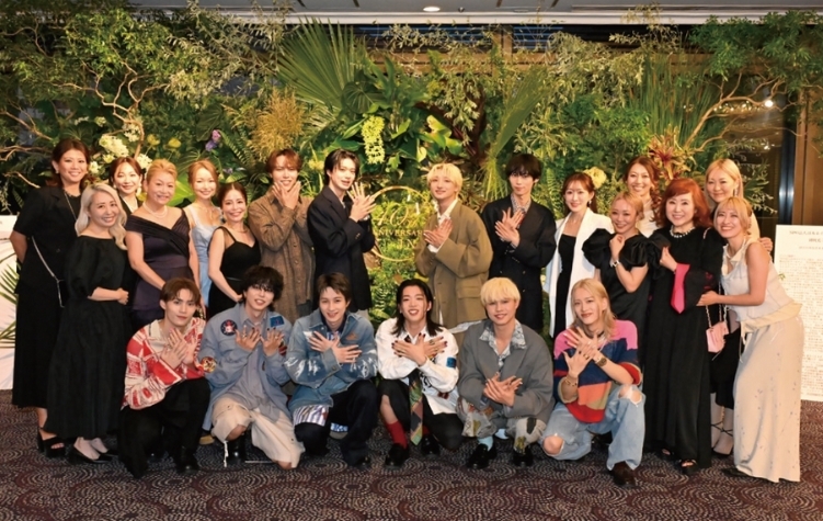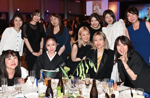 歓談に入り、各テーブルにはフレンチのフルコースがサーブされ、あちこちに交流の輪ができて華やかなお祝いムードに包まれました。ステージ上のスクリーンには、JNA 創立 40 周年を記念して全国で開催しているネイル無料体験のレポート映像や、著名人の皆さまからの40周年おめでとう動画などが放映され、さらにはステージにJNA創立40周年記念アンバサダーのBUDDiiSも登場し、大変盛り上がりました。