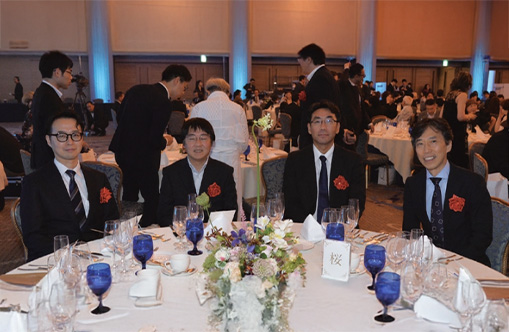 特定非営利活動法人日本エステティック機構理事長 福士政広様、東京都美容生活衛生同業組合専務理事 村橋哲矢様、全国美容用品商業協同組合連合会副理事長 前田貴之様、 一般社団法人日本エステティック業協会理事長 黛照男様、一般社団法人日本全身美容協会理事長 松本毅様、 特定非営利活動法人日本スパ&ウェルネスツーリズム協会 理事長 岡田友悟様が登壇し、福士様の挨拶と全員のご発声で会場の皆様と乾杯しました。
