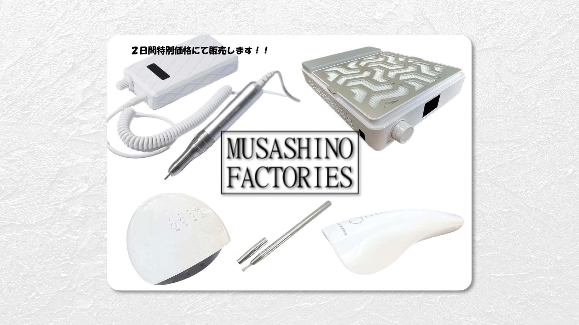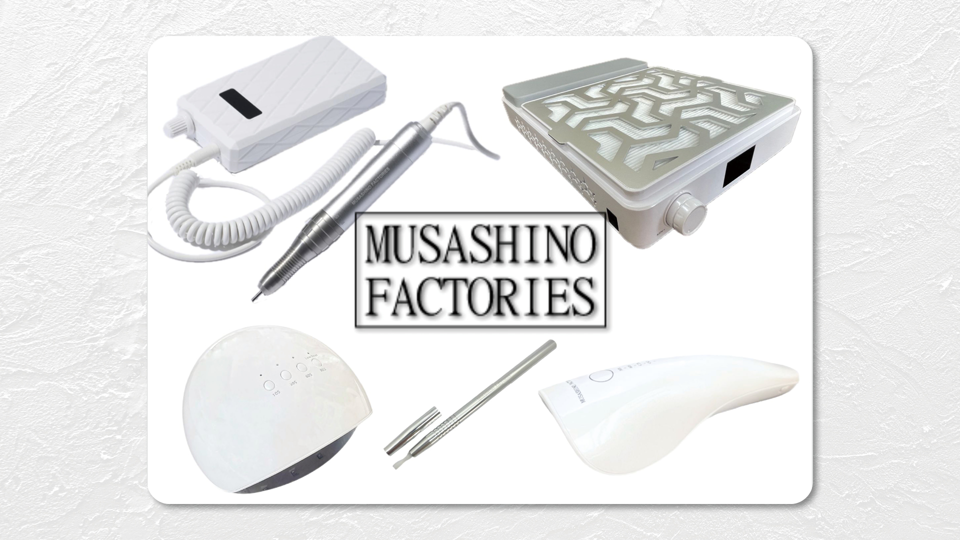 発売から大好評のネイルブランド「MUSASHINO FACTORIES」よりネイルマシーン、LEDライト、ハンディLEDライト、 集塵機を特別価格にて販売します!