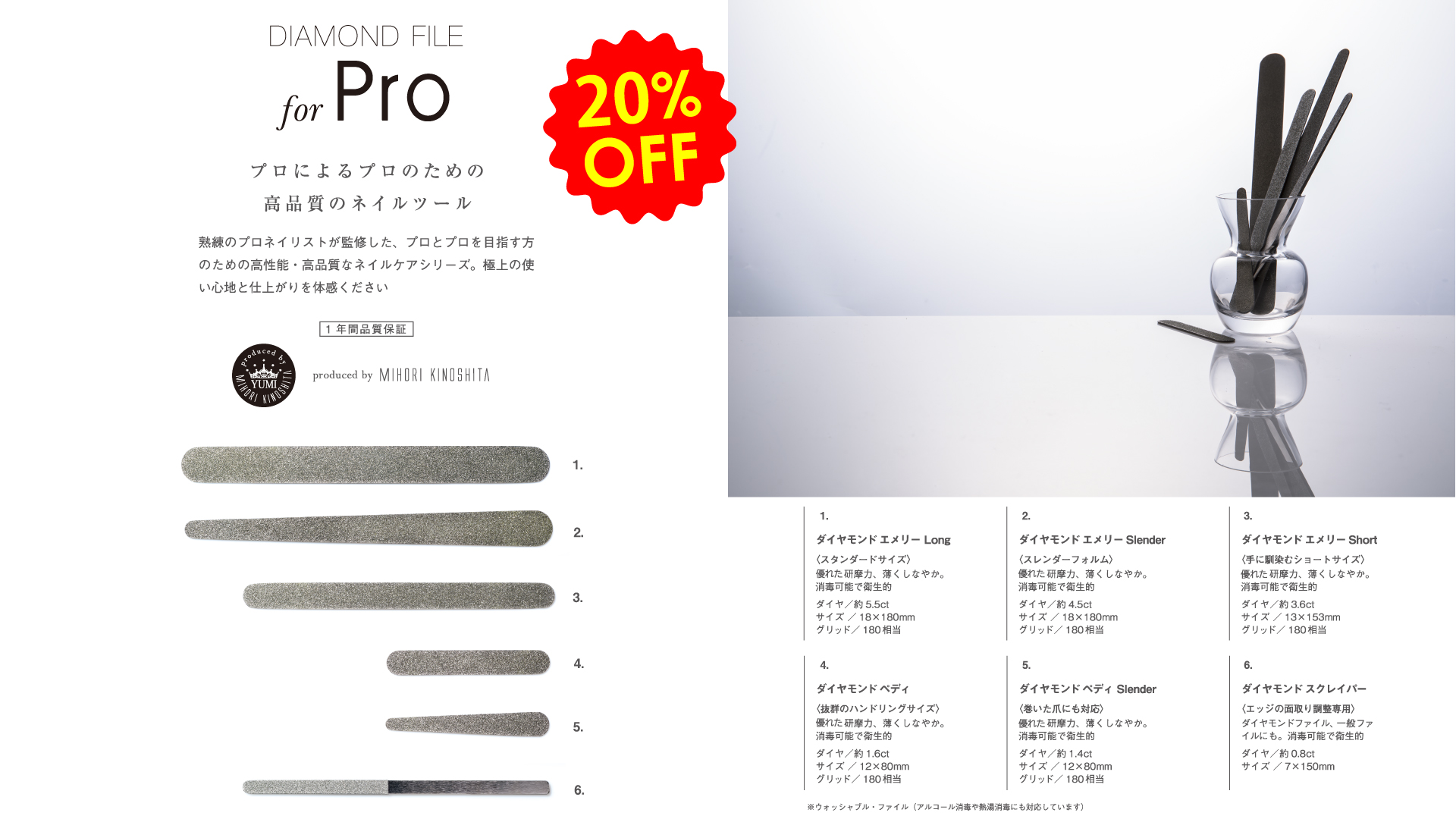 ネイル業界のフロントライナー木下美穂里が鑢の老舗GOEIとタッグを組んだ、特殊グラスファイバーにダイヤモンドを電着させた高品質なネイルケア用ファイルを発表。そのしなやかさと、繊細な仕上がりは他に類を見ない使い心地。各ブランドのOEM生産も対応可能。プロラインに注目のプロ用フットファイルや大人気ホームケア用ファイルもラインナップ!待望の商品「ネイルプッシャー」も東京ネイルエキスポ2025にて販売!