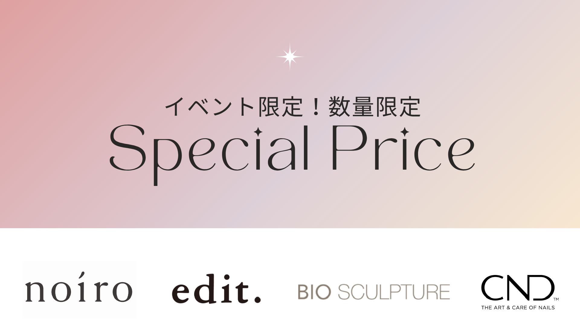当日は国産ブランド「noiro」「edit.」、輸入ブランド「BIO SCULPTURE GEL」「CND」、イベント限定の特価商品も多数ご用意してお待ちしております。