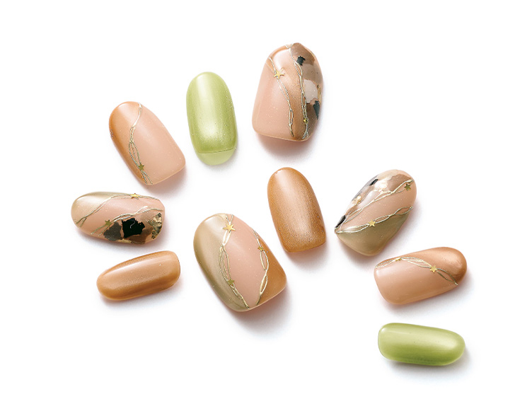 上品なベージュを基調とし、煌めきをプラスすることで、華やかさを演出。ネイルの先端をクリアに仕上げることで、単なるシンプルに留まらない、洗練されたデザインにしました。
