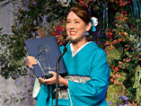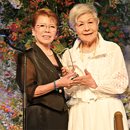 式典のフィナーレでは、この式典の司会者でもある平山深雪さんと図師英嗣さんに対して「サプライズ表彰」を行いました。JNAのイベントに欠かせない存在となったお二人に感謝を込め、仲宗根幸子理事長より表彰状とトロフィーが贈呈されました。台本にもない演出に感激し、涙ぐむ様子に会場から温かい拍手が贈られました。