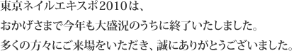 NPO法人日本ネイリスト協会(JNA)では、2010年11月28日(日)と29日(月)の2日間にわたり、東京国際展示場<東京ビッグサイト>東5・6ホール(東京都江東区)で「東京ネイルエキスポ2010」(後援:東京都)を開催しました。