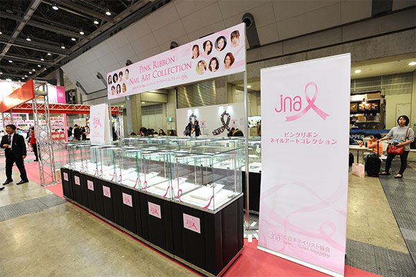 ピンクリボン運動に賛同いただいた著名人とトップネイリストがコラボしたピンクリボン「ネイルアートコレクション」が展示され、隣接したカフェコーナーも多くの人で終始賑わいをみせておりました。