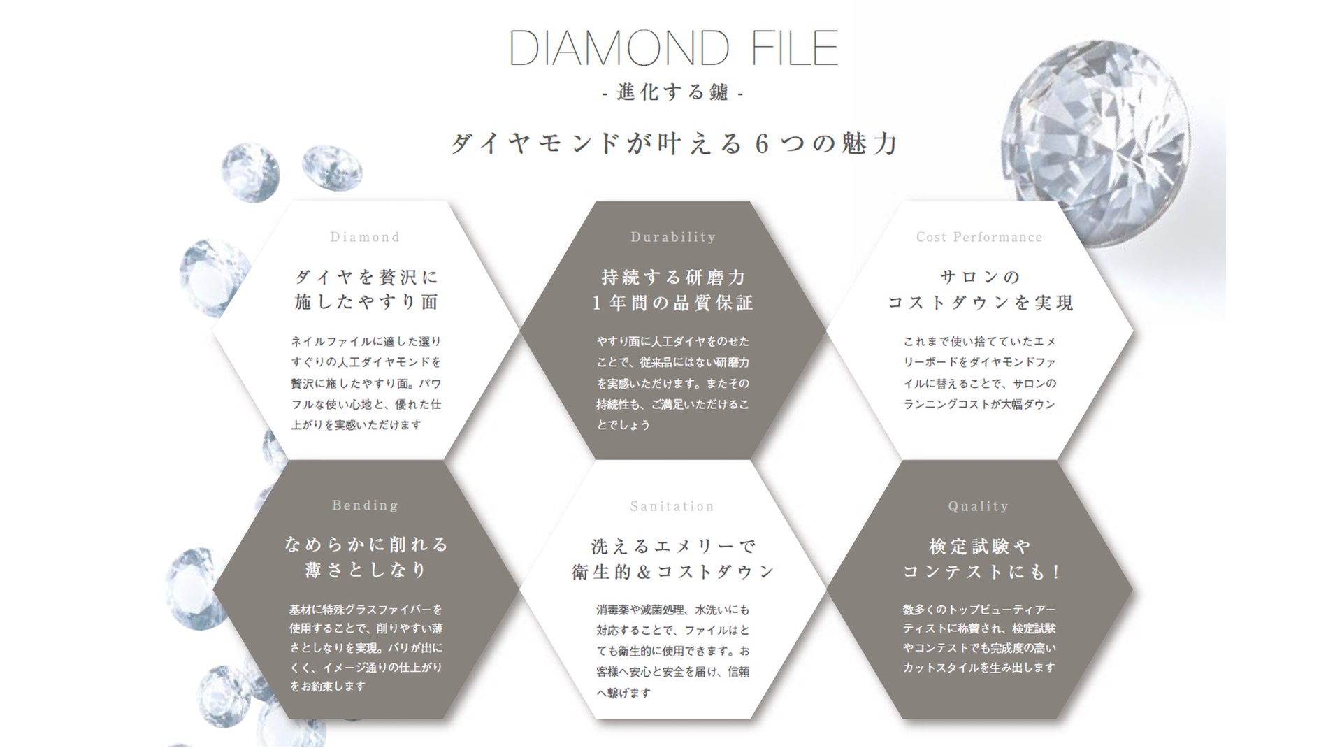 ネイル業界のフロントライナー木下美穂里が鑢の老舗GOEIとダッグを組んだ、特殊グラスファイバーにダイヤモンドを電着させた高品質なネイルケア用ファイルを発表。そのしなやかさと、繊細な仕上がりは他に類を見ない使い心地。各ブランドのOEM生産も対応可能。