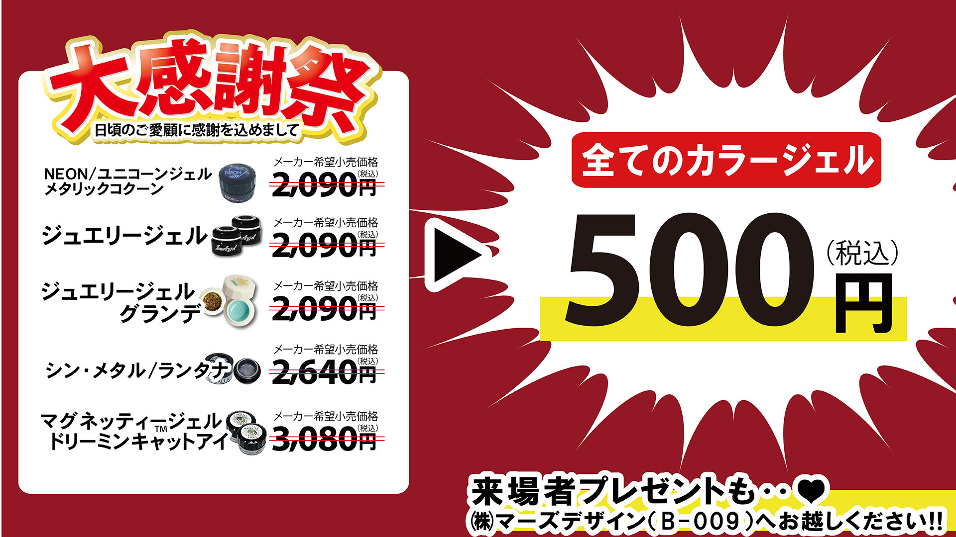 マーズデザインは化粧品製造許可を持った国内自社工場で製造、開発を行っており、ノンアクリル酸、ノンヘマで作られた爪に優しいノンアレルギージェルづくりをモットーにしています。ブースではイベント特別価格での商品販売の他、エデュケーターチームによる1本無料アートも行います!OEMも随時承っており小ロットのご注文も対応可能。皆様のお越しをお待ちしてます。
