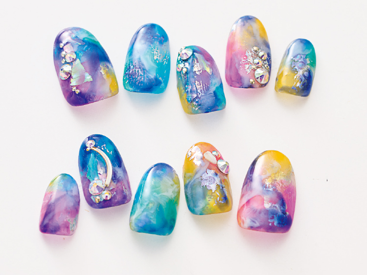 多色偏光ラメをベースカラーとして使用し、透け感のあるミクスチュアがアクセサリーのように存在感を出すことで、見れば見るほど「個性」を楽しむことのできる作品をイメージしました。