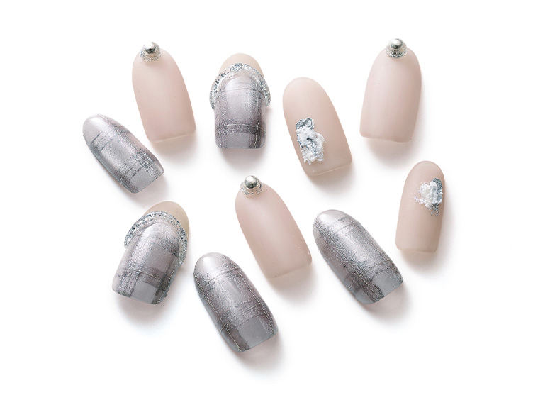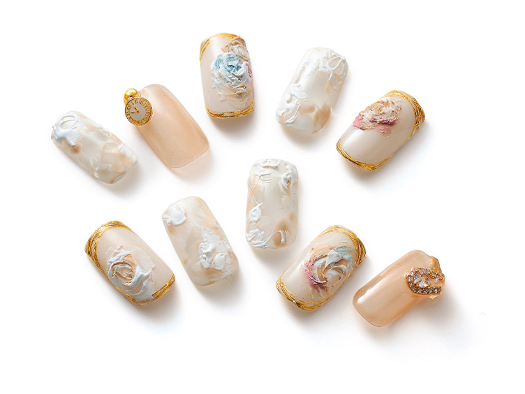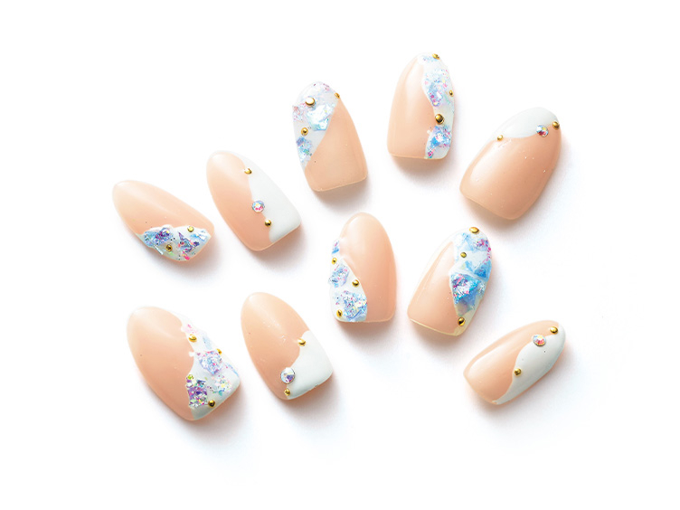 上品なベージュを基調とし、煌めきをプラスすることで、華やかさを演出。ネイルの先端をクリアに仕上げることで、単なるシンプルに留まらない、洗練されたデザインにしました。
