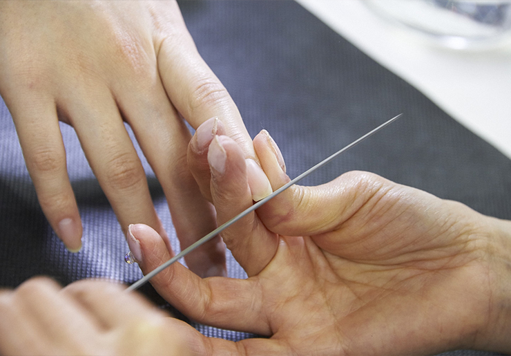 また、メタルプッシャ−の角度や動かし方、パサつきが出ないようにルースキューティクルを処理するネイルニッパーの使い方までしっかり時間をとって解説。左手薬指にチップ&ラップを施す際は、「2級検定試験対策としてチップオンを完全に理解しておくと1級検定試験は楽に臨めます」と、こちらもじっくりとレクチャーしてくれました。