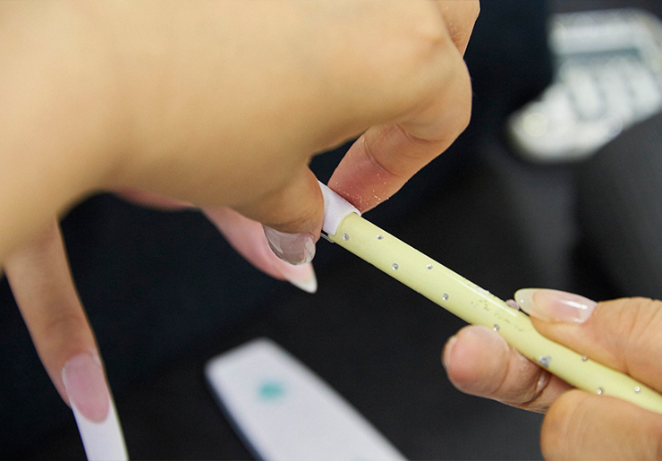 また、癖のある爪で練習していると、フォームの付け方などをより工夫するようになるので、サロンワークでいろいろなお客さまが来ても対処できるとも言っていました。ハンドモデルの爪の癖を理解することは重要ですが、日下部さんはむしろ癖のある爪に対処するのを楽しんでいるようにも見えました。