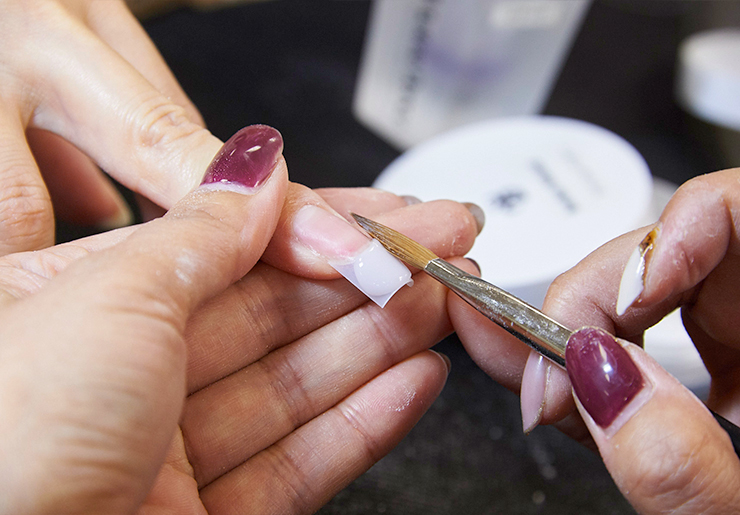 アプリケーションでは、太田さんはチップオーバーレイもスカルプチュアも、先端はナチュラル、ネイルベッドはクリアのミクスチュアで制作。最初にフリーエッジ部分の厚みを作ることで、ネイルベッドの厚みをその厚みに合わせて作れるからで、均一な作品作りのコツが垣間見えました。一見難しそうに思えますが、むしろナチュラルのみで作ると厚みがわからなくなるので、かえって難しいそうです。また、アプリケーションで理想に近い形にしておけば、ファイルの手間も減るため、時短にも繋がります。